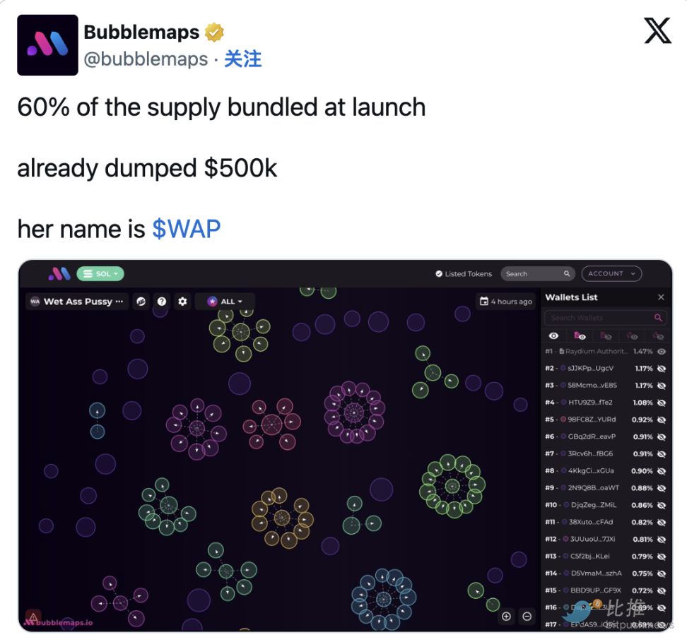 Bubblemaps 共同創辦人兼 CEO Nick Vaiman 在接受 Decrypt 採訪時表示:「許多代幣從一開始就存在明顯的危險訊號,比如高度控盤、惡意操縱以及明顯的‘割韭菜’策略。」