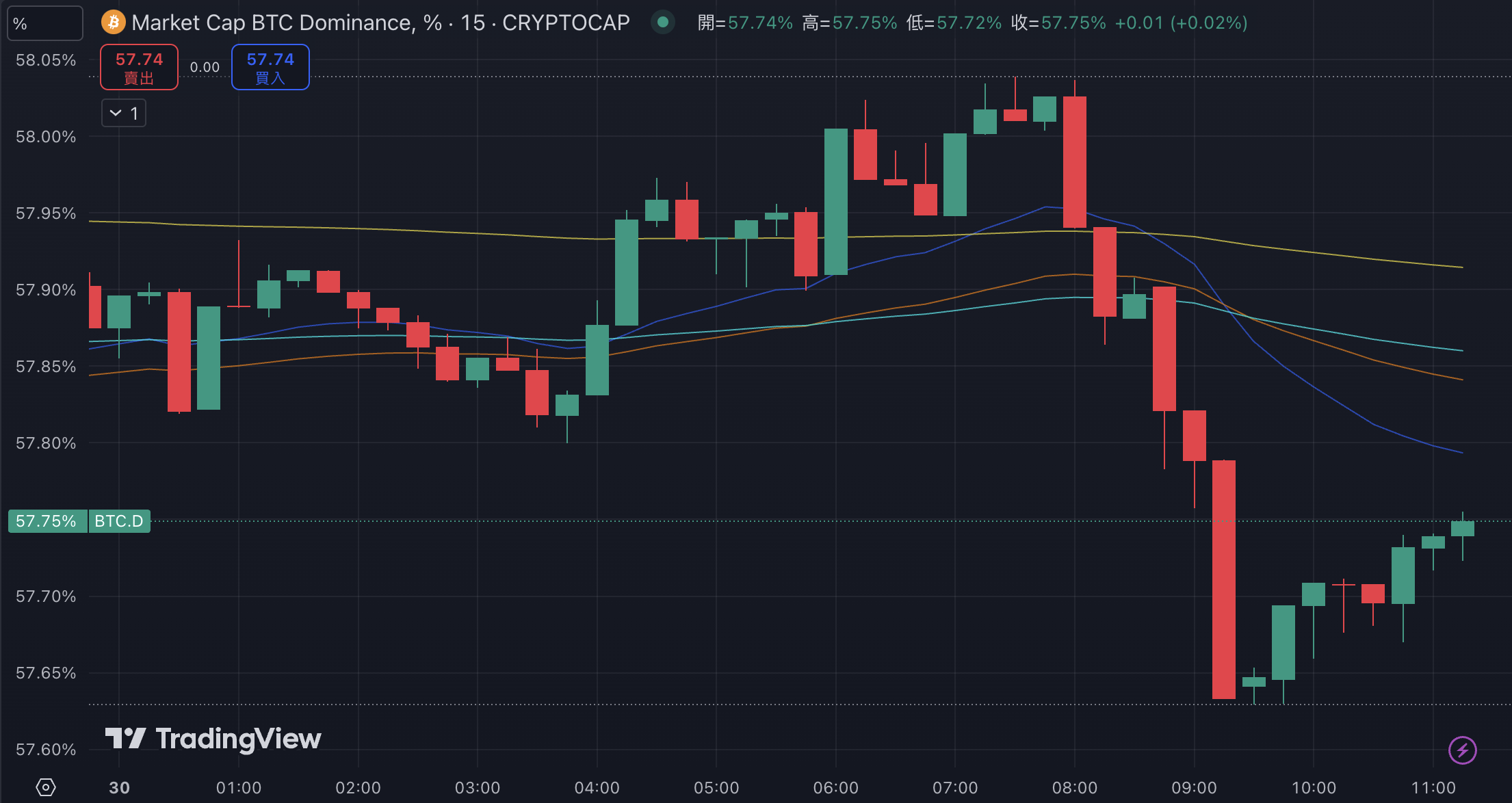 同時,隨著比特幣表現較為疲弱,BTC.D(比特幣市占率)呈現下滑,最低跌至 57.63%,這與上個月創下的 61.53% 高點相比,已下降 6.33%。截稿前 BTC.D 略微回升至 57.75%,近 24 小時下跌 0.43%。