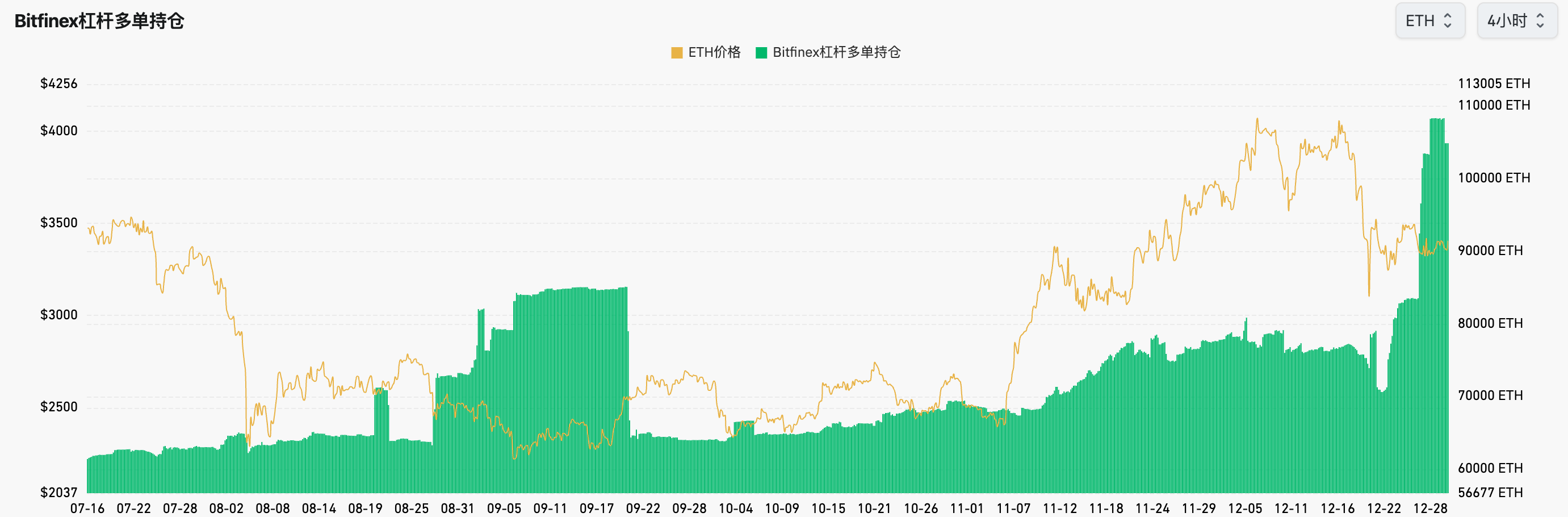 此外,Coinglass 數據顯示,Bitfinex 上的 ETH 槓桿「多單」持倉量從 12 月 22 日的不足 7.1 萬枚 ETH,成長至目前的 104,847.23 枚 ETH,增長幅度高達 48%。這反映出市場在 ETH 低位盤整期間,對其未來上漲抱有高度期望。