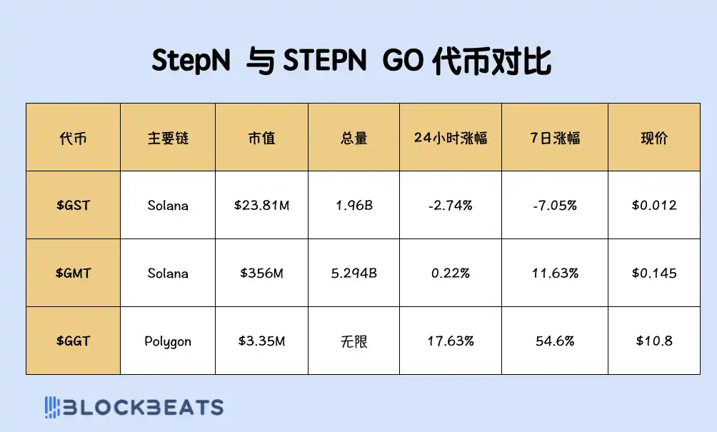 StepN 使用 GST 和 GMT 作為主要代幣,而在 STEPN GO 中,新增了 GGT (Go Game Token),它被部署在 Polygon 鏈上,並且沒有代幣數量限制。