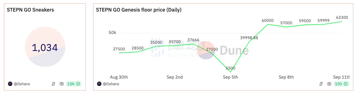 GGT 和 GMT 短期的上漲,對於還沒有入場的新玩家來說,並不那麼友好。因為 GMT 的上漲也推高了跑鞋的價格, STEPN GO 創世鞋從幾天前的 35,000 個 GMT 飆升到了 63,300 個 GMT,不過好在普通鞋的價格增長沒有那麼明顯,還在 35,000 個 GMT 左右。