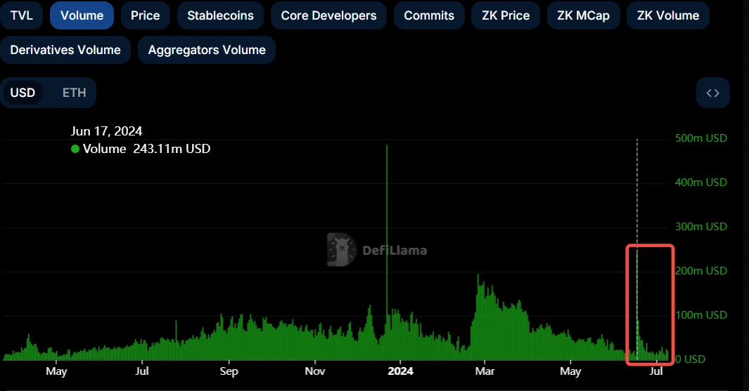 根據 Defillama 的資料,因為領取空投的需求,6 月 17 日 ZKsync Era 網路交易量達到了 2.4 億美元,創下 2024 年最高記錄。但當空投領取完後,日交易量迅速回歸平均水平,也無明顯下跌。