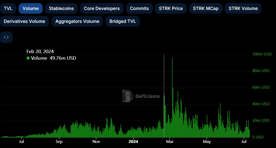 根據 Defillama 的資料,Starknet 網路日交易量在空投前後並無明顯變化,空投結束後並未影響使用者在 Starknet 網路上交易的熱情。