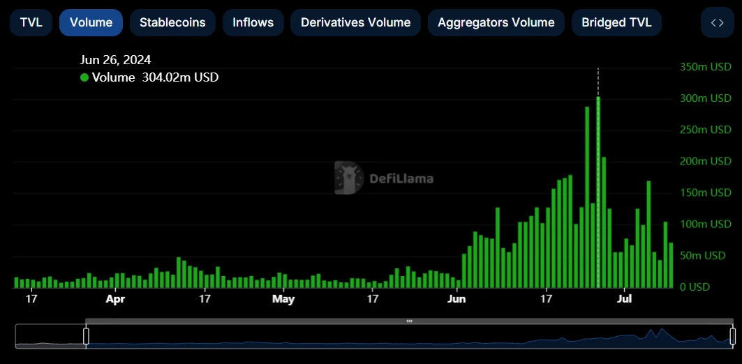 根據 Defillama 的資料,6 月份 Blast 網路的交易量呈上升趨勢,6 月 26 日因空投領取達到歷史最高,但很快回到了空投前 6 月份平均水平。