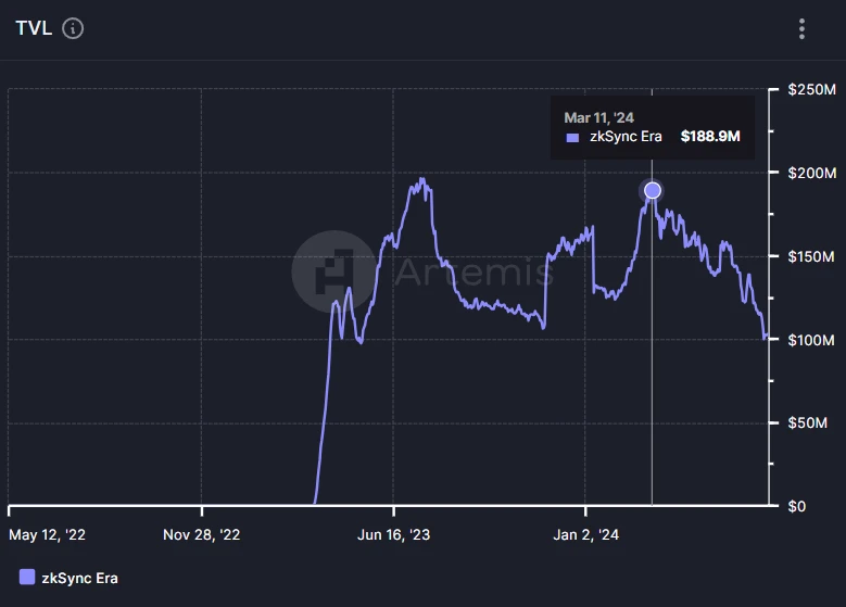 根據 Artemis 的資料,ZKsync Era 網路的 TVL 以 U 本位計算在今年 3 月份未開始空投前就已經呈現下跌趨勢,6 月份空投之後 TVL 仍在持續下跌。