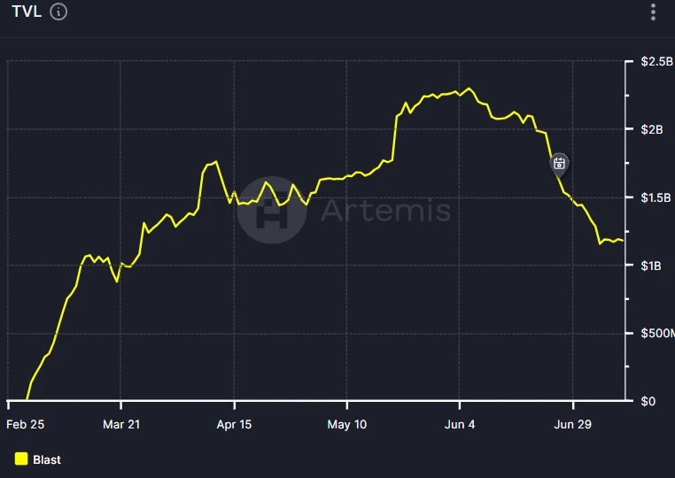 根據 Artemis 的資料,Blast 網路的 TVL 在其官方 6 月 20 日宣佈即將空投訊息時就已經開始呈現下跌趨勢,而實際到 6 月 26 日空投後,下跌趨勢更加明顯,資金正在撤出 Blast。