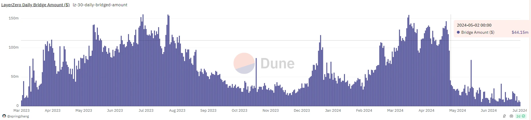 根據 Dune 資料,每日使用 LayerZero 進行跨鏈的資金在官方宣佈快照後驟降,每日平均保持在 1500 萬美元左右,與空投前高峰期相比,減少了 90% 以上。