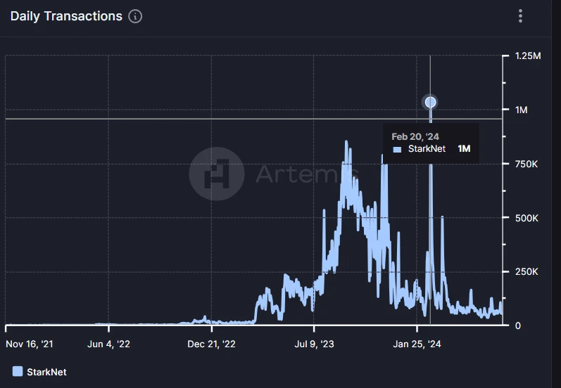 但日交易筆數卻呈斷崖式下跌。根據 Artemis 的資料,2 月 20 日空投當日 Starknet 網路日交易筆數創新高,但之後總體呈下跌趨勢,遠不如空投前水平。