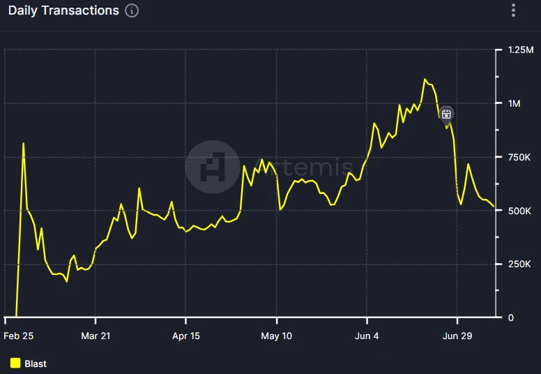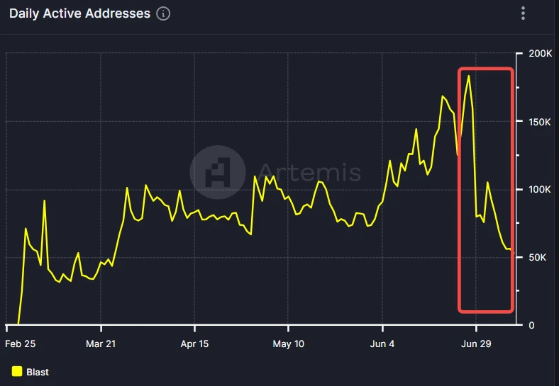 根據 Artemis 的資料,6 月份 Blast 的日活躍地址數整體處於上升趨勢,表明使用者對於 Blast 的信心實際在增加。但當 6 月 26 日空投落地,日活躍地址數驟降,短短几天回到了 3 月份時的水平,並且這種下降趨勢仍在繼續。