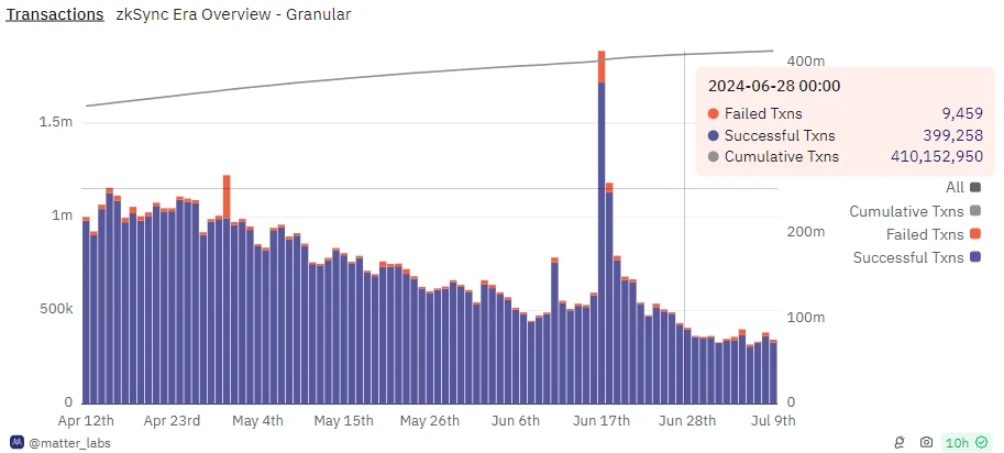 根據由 Matter Labs 建立的 Dune 儀表盤顯示,空投當天 ZKsync 的日活躍地址數創下歷史新高。當大部分使用者領取完後,日活躍地址數於空投當天相比下降約 70%,但與空投前相比較,只下降了約 40%。