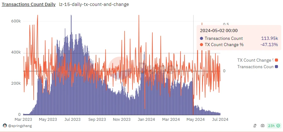 同時,使用 LayerZero 的日交易筆數在宣佈快照結束當天也下跌約 47%,空投後日交易筆數平均保持在 2 萬左右,與空投前平均 20 萬的日交易筆數相比,也減少了 90% 以上。