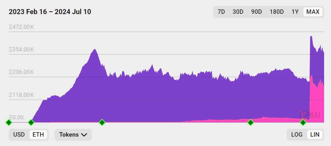 但是根據 L2beat 的資料,以幣本位計算,ZKsync Era 網路空投後的 TVL 下降趨勢並不明顯。可見,其 TVL 降低受空投的影響並不大,而可能受其他因素(如整體賽道行情、幣價、生態建設等)影響較大一些。