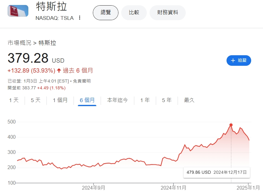 特斯拉(TSLA.O)股價在過去 6 個月內大漲 53.93%,最高於 2024 年 12 月 17 日達到 479.86 美元,隨後回落,目前報收 379.28 美元。