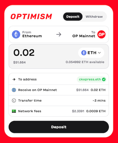 儘管如此,我經常接觸 web3 使用者,目測很多還沒開始使用 L2,除了受些微學習門檻所擋,也因為得先把資產從 L1 跨鏈到 L2,而這些交易正正就是在主網上,手續費不低。我剛於 Superbridge 測試,一筆把 ETH 從以太坊主網跨鏈到 Optimism 的交易,以當時 Gas 費 2.2 Gwei 計算,手續費為 0.0009 ETH 即約 2.3 鎂,還好,摳門的話還能捕捉 Gas 費跌至 1 Gwei 甚至更低的時機,再省 1 鎂左右。