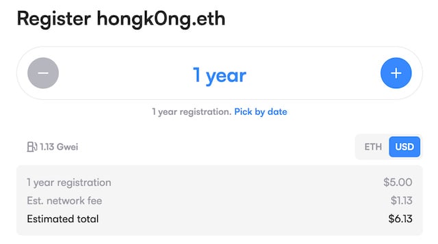 另一個單是註冊所需手續費就讓人心痛的是 ENS 網址,Ethereum Name Service。ENS 可說是以太坊版的 DNS Domain Name System,把難以記憶又容易輸入錯誤的錢包地址,對應至簡潔的名稱,比如說,知道我的 ENS ckxpress.eth,要支援這個文字工作者(多謝 🙏🏼),只要發 ETH、USDC 或其他密碼貨幣到 ckxpress.eth 即可,多數錢包都能解讀。