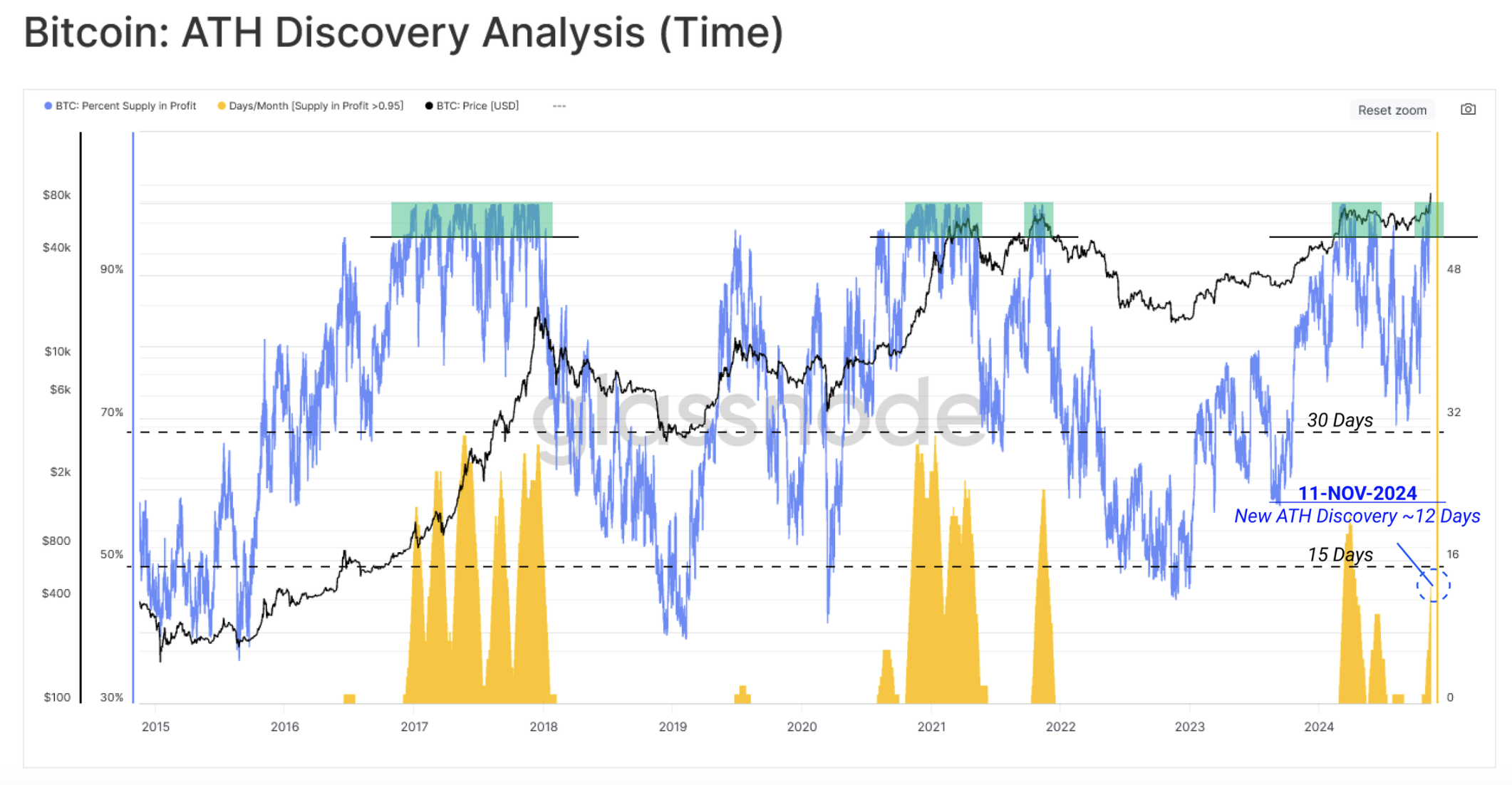 下圖展示了有盈利的供應百分比(藍線),以及每個月中超過 95% 供應處於盈利的連續天數(黃色),為市場調整時機提供了參考。