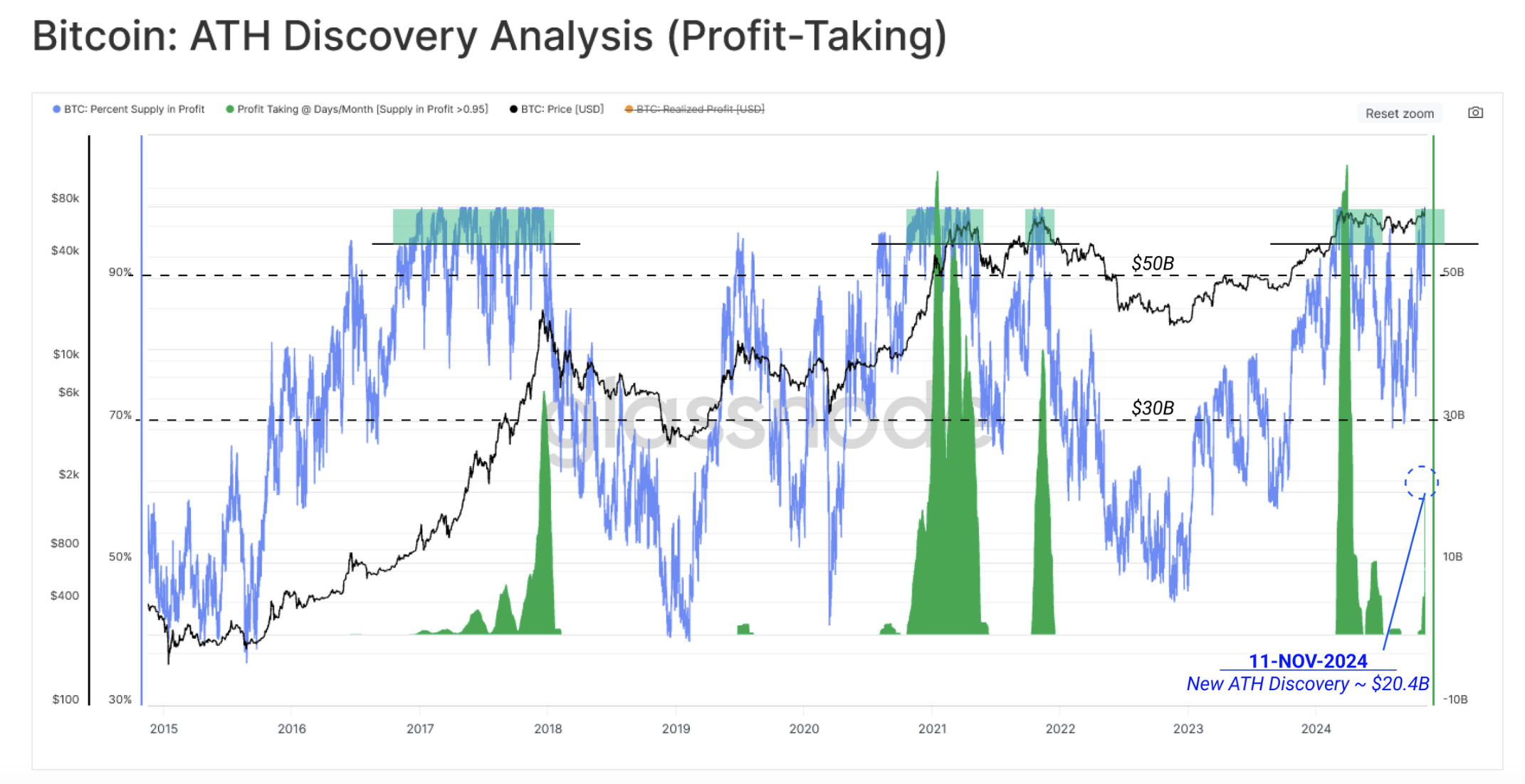 Glassnode 解釋,在 ATH 發現階段中,比特幣價格通常會多次接近並測試上限(圖中紅線),這是因為新投資者以更高價格進場,進而帶動強勁的需求動能推高價格。然而,若新資金的進場不足以抵銷早期投資者的獲利了結,則價格可能出現修正。