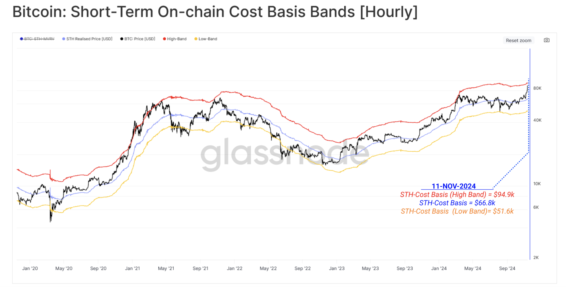 Glassnode 使用下圖中的短期投資者成本帶寬,來預測比特幣價格在什麼水平可能會遇到強勁的獲利回吐情況。