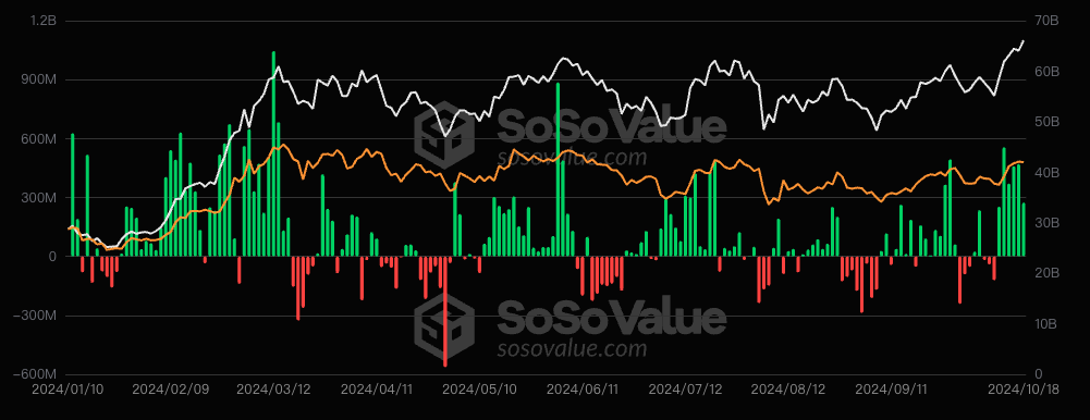 - 根據 Sosovalue 數據顯示,從 10 月 11 日開始,比特幣現貨 ETF 已連續 6 天呈現淨流入,並且每日流入淨值皆超過 2.5 億美元,這意味著傳統金融機構逐漸看好並購入比特幣這一資產。