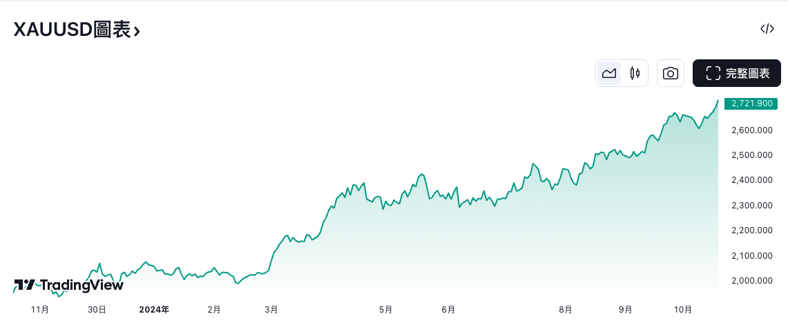 黃金現貨價格近期持續破新高,並在昨(19)日一舉突破 2700 美元大關,今日更是達到 2722 美元/盎司的歷史高點,現報 2721.9 美元/盎司,今年迄今漲幅高達 31.94%。