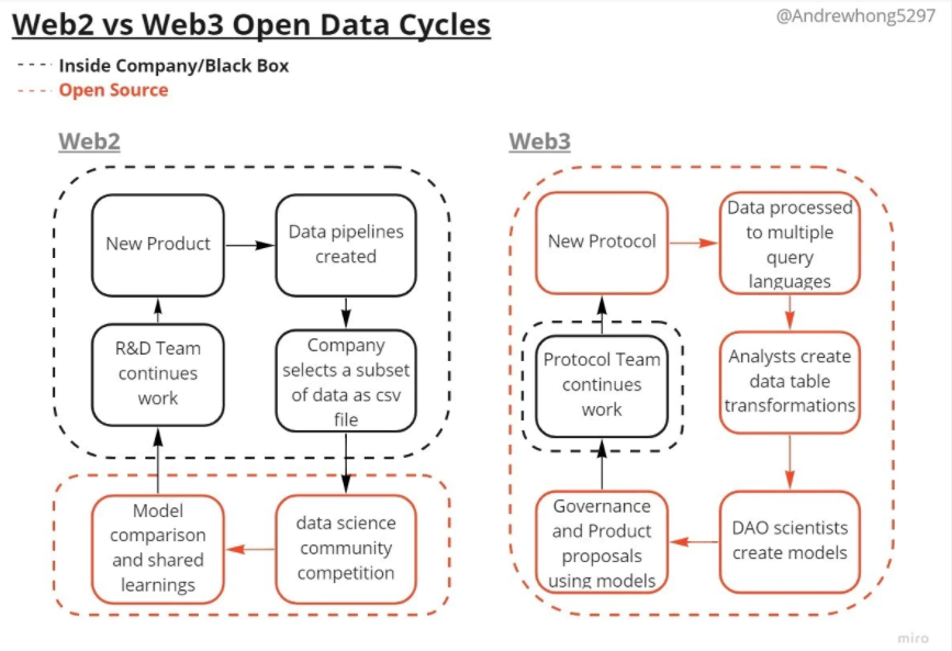 Web3 也將數據開源,這意味著不再只有數據科學家在開放環境下工作,分析工程師和數據工程師也在開放環境下工作!每個人都參與到一個更連續的工作流程中,而不是一個幾乎是黑盒的數據循環。