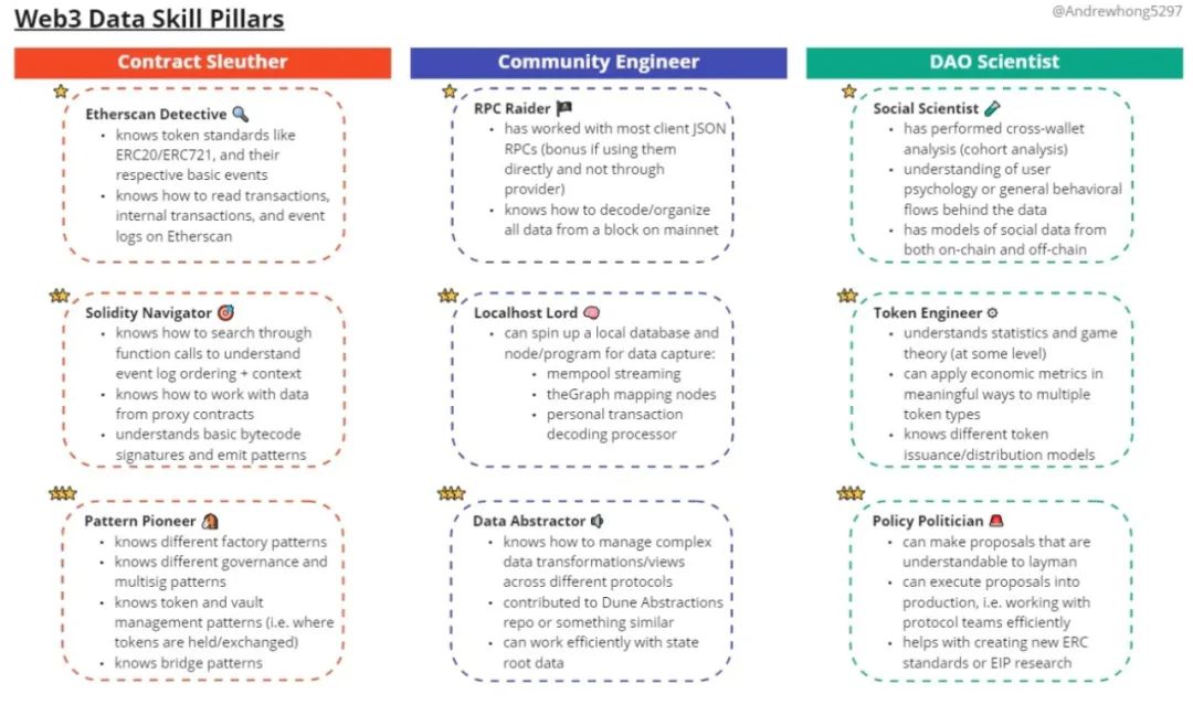 不用說,你也應該在這些社群中尋找可以加入你的團隊的人。讓我們進一步分析重要的 web3 數據技能和經驗,這樣你就能真正知道你在搜索什麽。如果你想被聘請,把這看作是你追求的技能和經驗!