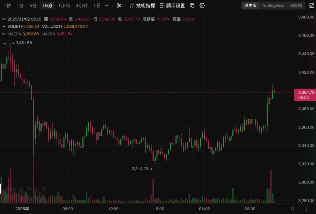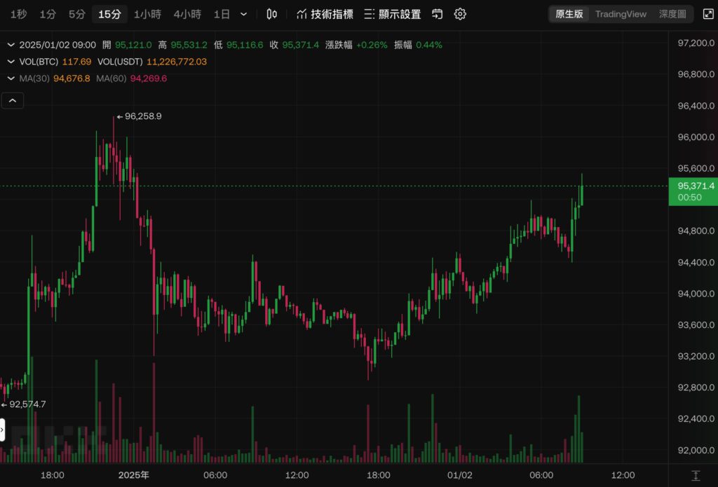 比特幣在元旦傍晚最低一度跌破 9.3 萬美元之後,開啟一波震盪上漲,撰稿當下成功突破 9.5 萬美元,現報 95,371 美元。近 24 小時上漲 1.28%。