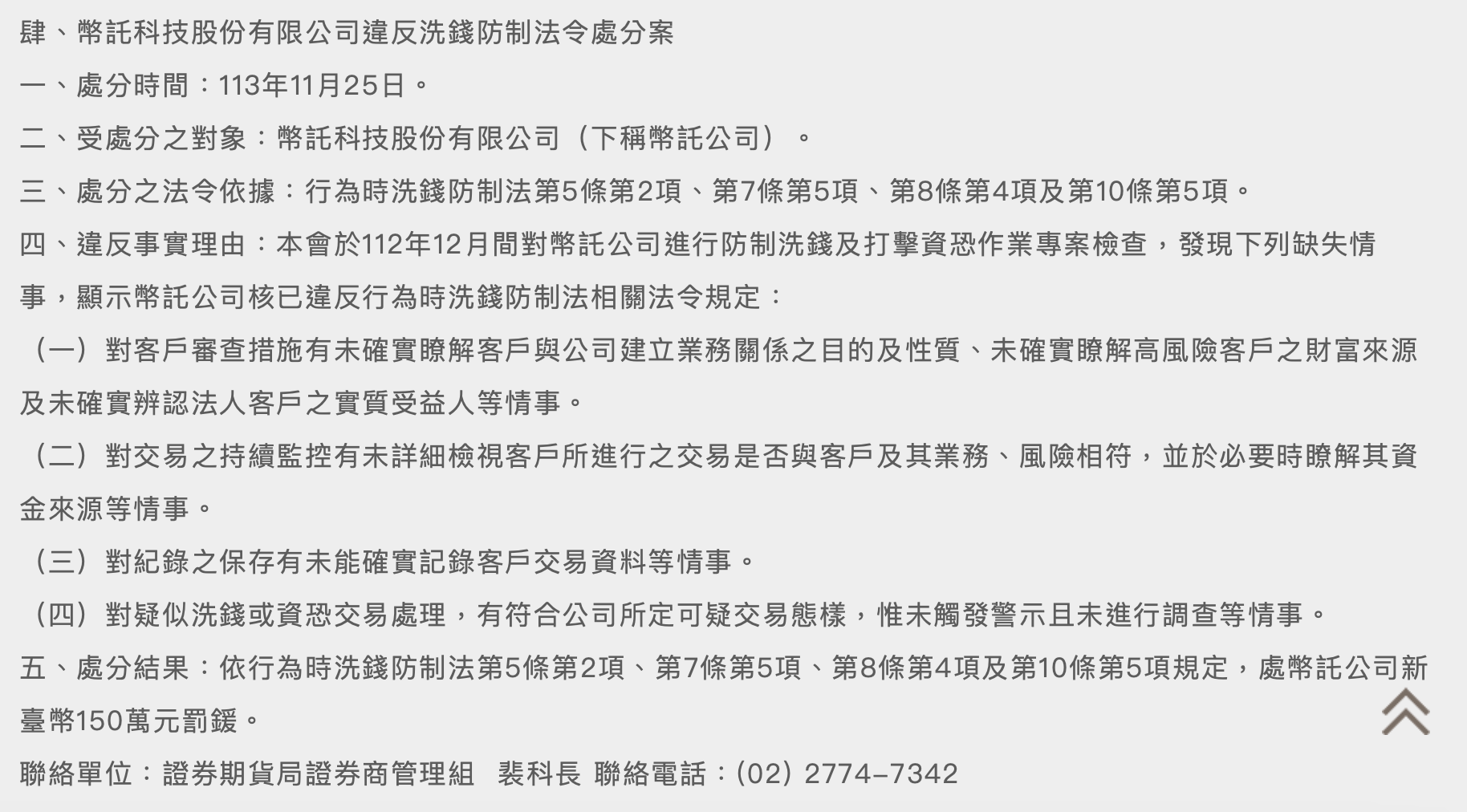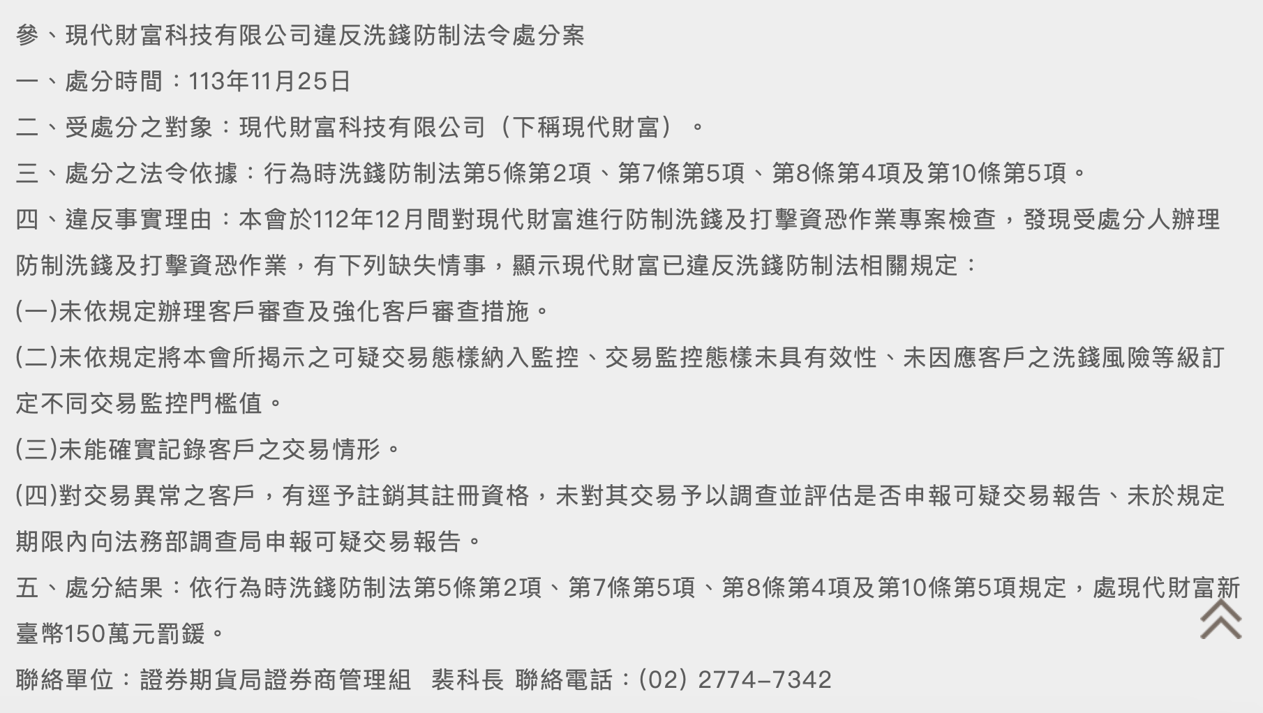 根據近日金管會證期局公告,對於現代財富科技有限公司違反洗錢防制法令處分案,說明如下: