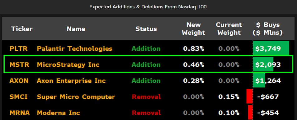 據彭博社 ETF 分析師 James Seyffart 稱:MicroStrategy 可能會在 12 月 23 日進入納斯達克 100 指數,隨後將淨買入至少 21 億美元的股票。