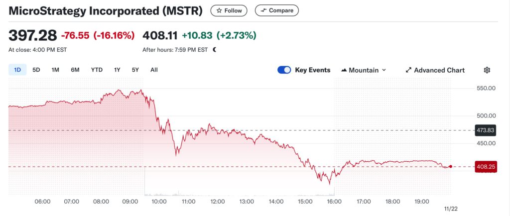 伴隨利空消息,微策略股價昨日排中一度下跌超 20%,收盤後有所回彈,收在 397.28 美元,市值也下滑到 805 億美元。