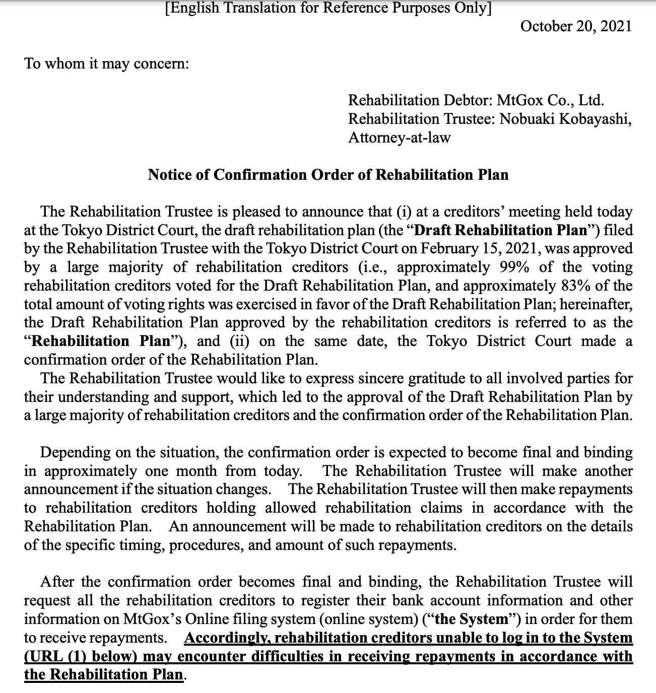 有世界最惡交易所之稱的 Mt.Gox 的委託人 Nobuaki Kobayashi,週三發公告宣布有 83% 債權人投票贊成了清償計畫。清償計畫最快在 11 月 20 日敲定,成為定局且具約束力後,債權人很快就可以在網站上註冊他們的銀行帳戶訊息來獲取賠償金額。