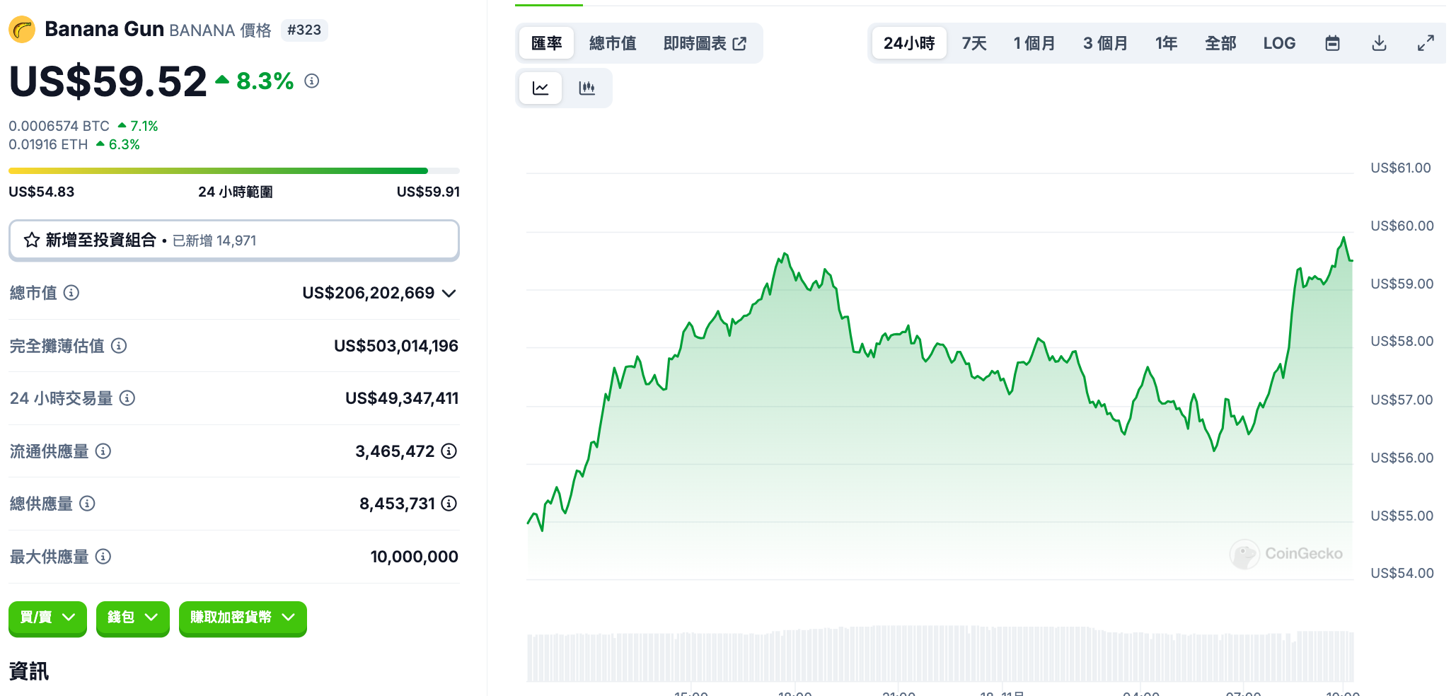 此外,與香蕉同名的代幣 $BANANA 也或受此影響上漲。該代幣是狙擊機器人 Banana Gun 的原生代幣,自馬斯克轉發後價格迅速攀升,截稿前報 59.52 美元,24 小時內上漲 8.3%。