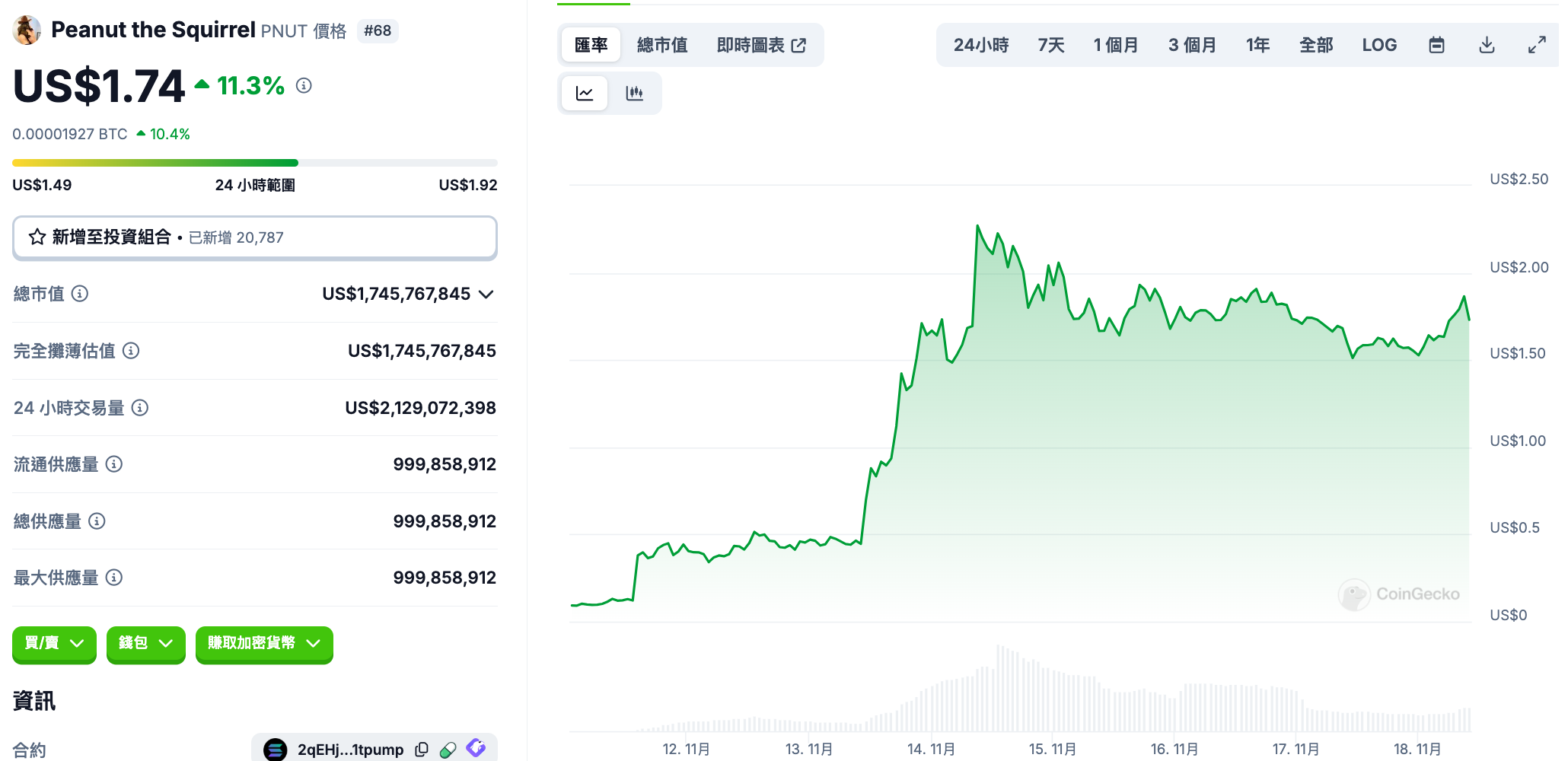 截稿前市值仍有 17.45 億美元,幣價現報 1.74 美元,近 24 小時上漲 11.3%。
