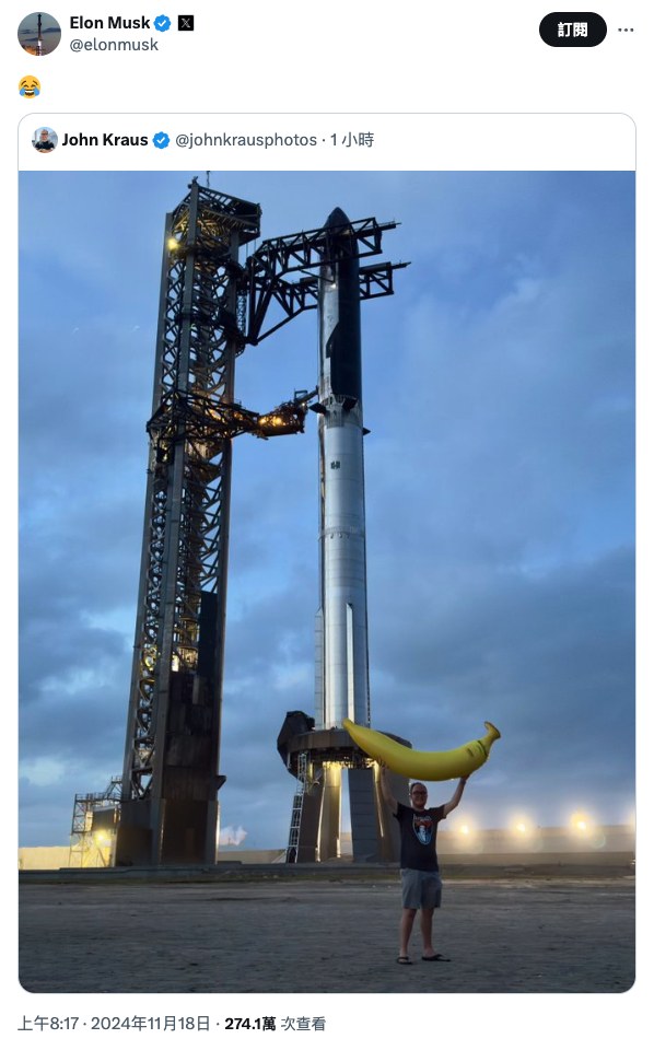 而就在今日早上,「狗狗幣教父」馬斯克更在 X 上轉發了 Polaris(由 SpaceX 支持的私人太空探索計劃)內容總監 John Kraus 手舉巨大香蕉站在 SpaceX 星艦前的照片,這迅速激起幣圈人的快速反應,眾多評論紛紛標記 $BANANA 和 $BAN,兩枚代幣隨即迎來價格上漲。