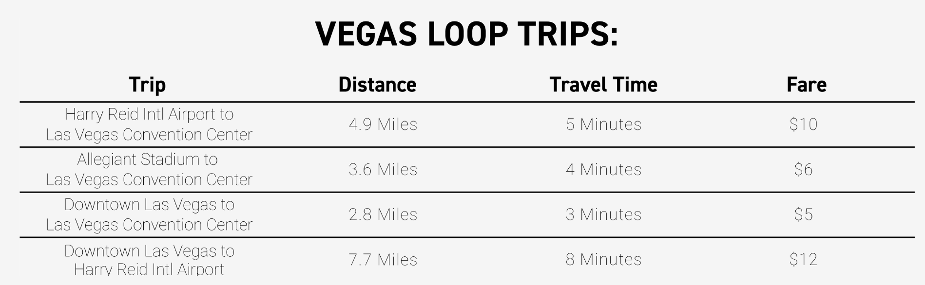 據 Boring Company 官網說明,Vegas Loop 目前有四條路線,其中站點包含哈里·里德國際機場、拉斯維加斯會議中心(LVCC)、聯合航空體育場(Allegiant Stadium)和拉斯維加斯市中心,依據距離長短的不同,票價介於 5 美元到 12 美元之間。