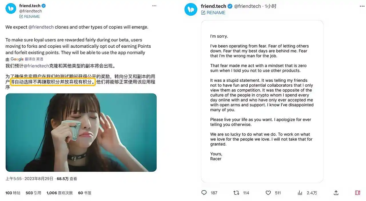 這種用力過猛最初的痕跡,我們去年曾在《兩級反轉,friend.tech 還是同意了你和仿盤做朋友》一文中提到過: