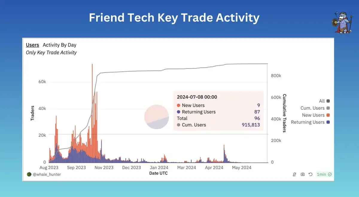 先講個鬼故事,資料顯示,今天 Friend.Tech 的日活躍使用者不到 100 人。而在上一輪狂熱中它的日活躍使用者一度突破了 7.7 萬人,算起來活躍使用者下降了 99.9%。