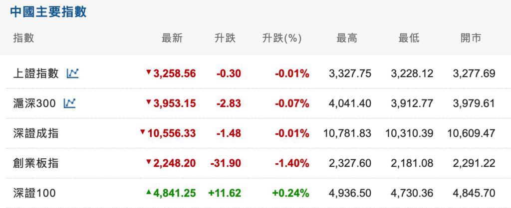- 創業板指:下跌 10.59%,或 270.18 點,收 2,280.10 點。