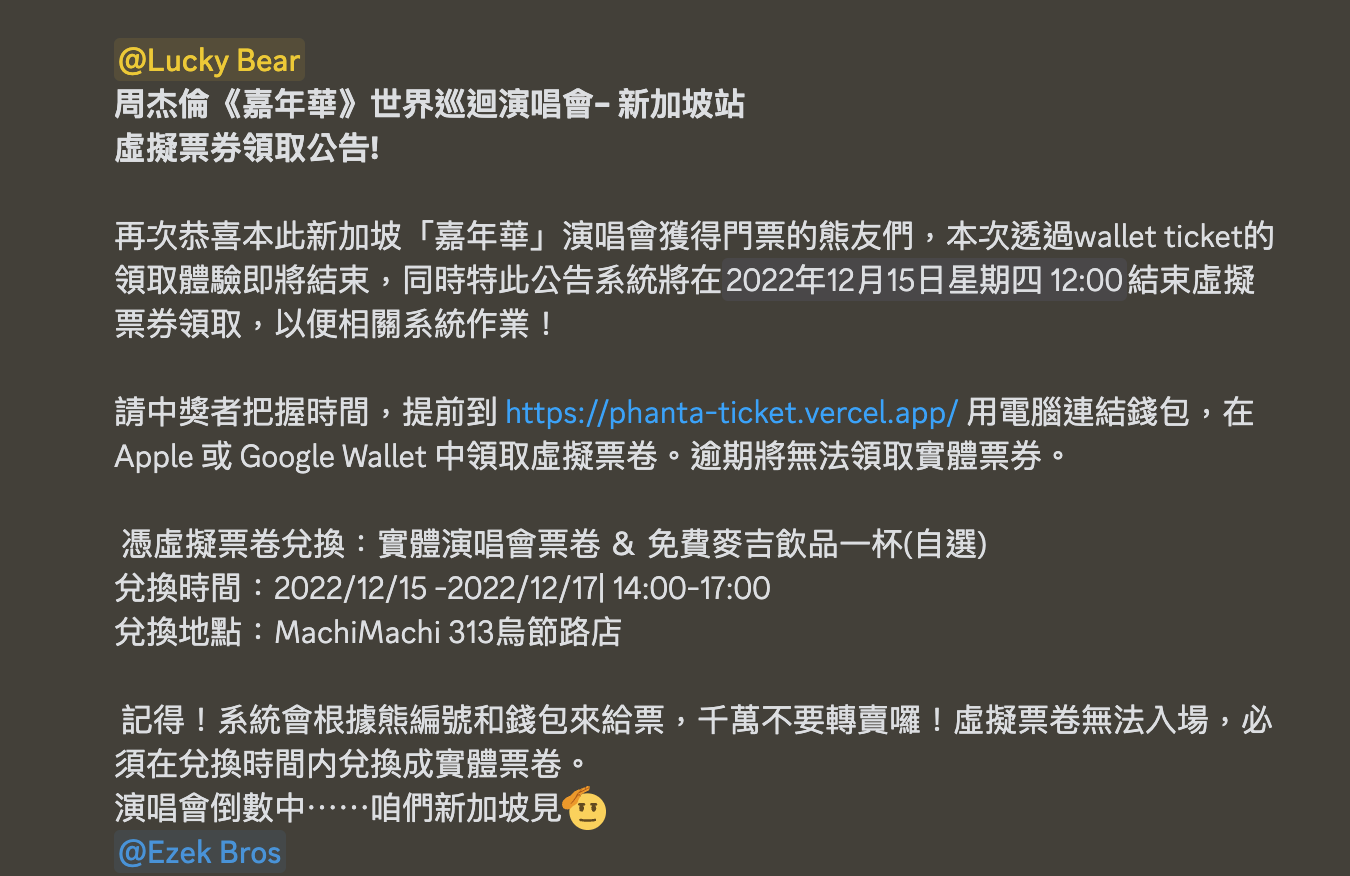 在 2022 年 NFT 依然熱火朝天之時,PhantaBear 社群如同其他 NFT 藍籌社群一樣熱絡,當時社群管理員會不定期向 NFT 持有人進行抽獎活動,其中獎品就包括「周杰倫嘉年華演唱會門票」,而許多投資人正是看上周董的演唱會門票,才會購買 Phanta Bear 成為持有者。
