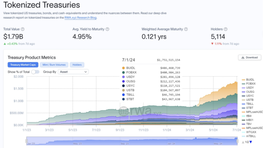 目前的高利率環境使得基於美債的代幣化用例受到市場的諸多關注,並且其產品確實能夠實現經濟效益,提高資本效率。根據 RWA.XYZ 資料,代幣化美債市場規模已經從 2024 年初的 7.7 億美金上升到如今的 17.5 億美元(截至 7 月 1 日),上漲幅度達到 227%。