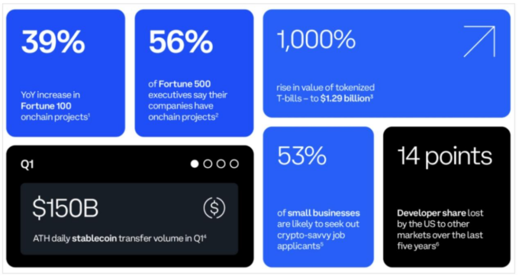 根據 Coinbase 的第二季度加密貨幣狀況報告,35% 的《財富》 500 強公司正在考慮啟動代幣化專案。7 家前 10 的 500 強公司高管正在瞭解更多有關穩定幣用例的資訊,主要對於穩定幣支付的低成本、即時結算。86% 的 500 強高管認識到資產代幣化對其公司的潛在好處,35% 的 500 強高管表示他們目前正在計劃推出代幣化專案(包括穩定幣)。