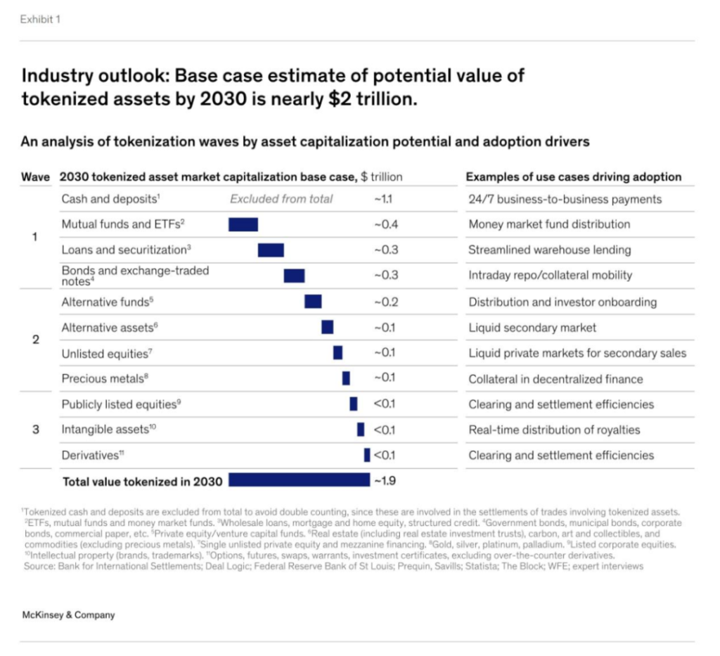 - 麥肯錫預計到 2030 年,代幣化市場的總市值可能達到約 2 兆至 4 兆美元(不包括加密貨幣和穩定幣的市值);