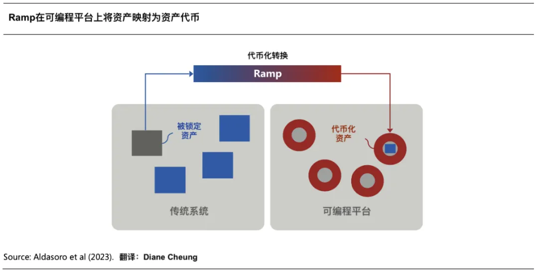 「代幣化」是指將存在於傳統帳本上的金融或實際資產的所有權(Claims on Financial or Real assets)記錄到區塊鏈可程式設計平臺上的過程,建立資產的數位表示。這些資產可以是傳統有形資產(如房地產、農業或礦業商品、模擬藝術品)、金融資產(股票、債券)或無形資產(如數位藝術和其他智慧財產權)。