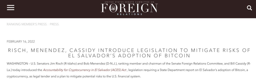 美國參議院外交委員會的資深成員 Jim Risch 、主席 Bob Menendez 和參議員 Bill Cassidy,週三(16)共同發佈了薩爾瓦多的加密貨幣問責法案 ( Accountability for Cryptocurrency in El Salvador,ACES ) 。
