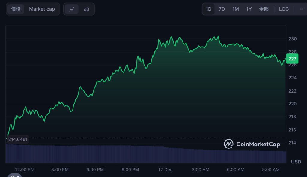 同時,Solana 代幣 SOL 昨日也隨著比特幣從市場中反彈,撰稿時報 227 美元,近 24 小時上漲 6%,相較 BTC 來得更為強勢些。