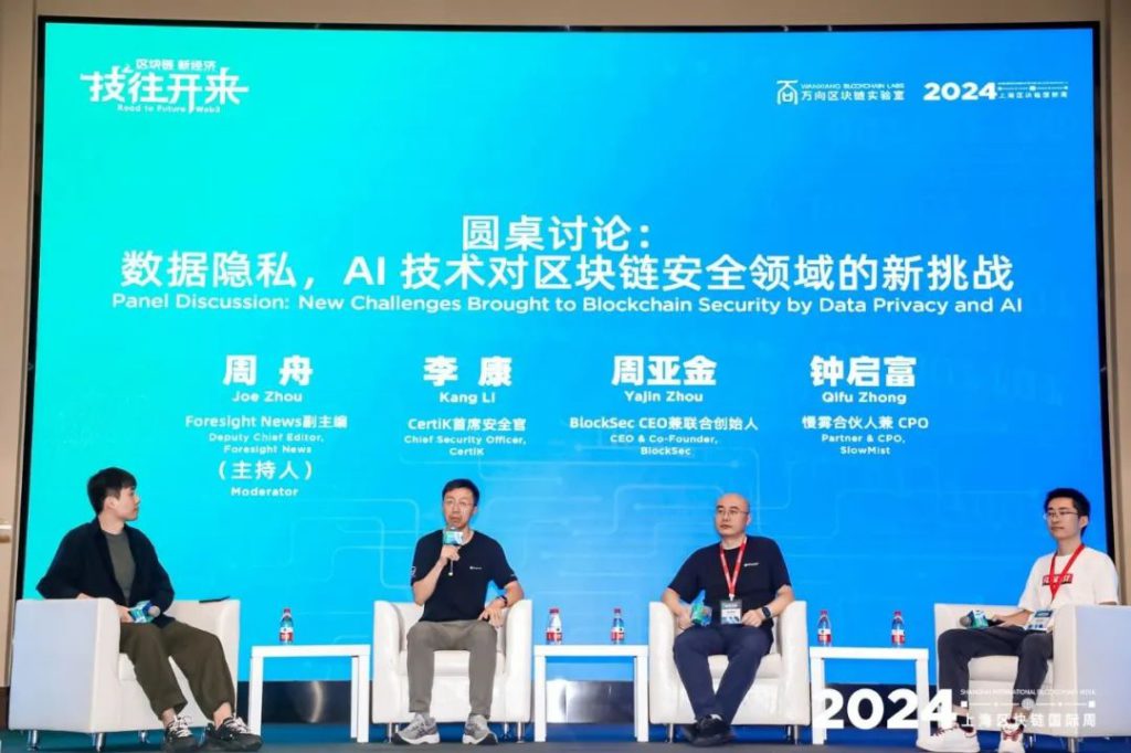 在 「資料隱私,AI 技術對區塊鏈安全領域的新挑戰」 圓桌討論中,主持人 Foresight News 副主編周舟與 CertiK 首席安全官、BlockSec CEO 兼共同創辦人周亞金和慢霧合夥人兼 CPO 展開深入交流。三位嘉賓指出,AI 技術加劇了裝置、系統、私鑰管理及系統設計等方面的安全問題,同時帶來了 Fishing 攻擊和 AI 換臉等社工新手段。然而,AI 也提升了審計報告效率和準確性,為區塊鏈安全帶來機遇。