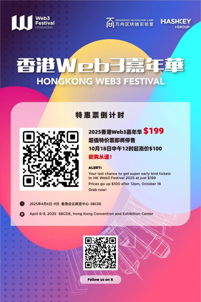 現距 2025 香港 Web3 嘉年華$199 特惠票截止僅剩不到 12 小時,讓我們相約 2025 香港 Web3 嘉年華,繼續見證區塊鏈技術在新紀元中綻放的無限光彩!趕快點選閱讀原文,前往活動官網購票參會吧!