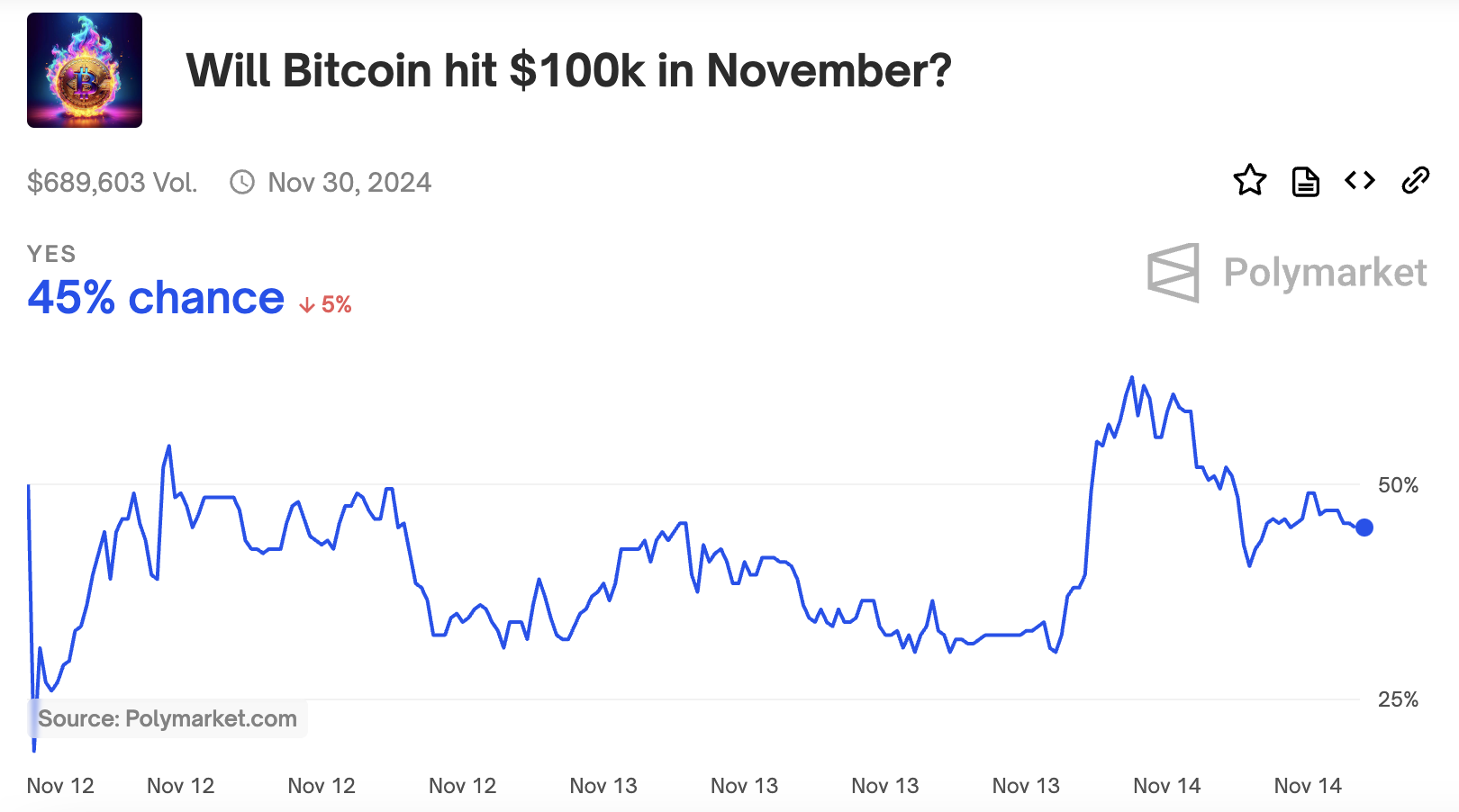 此外,精準命中川普當選總統的鏈上預測市場 Polymarket 數據指出,市場押注比特幣在 11 月前觸及 10 萬美元的機率一度超過 50%,目前已回落至 45%。
