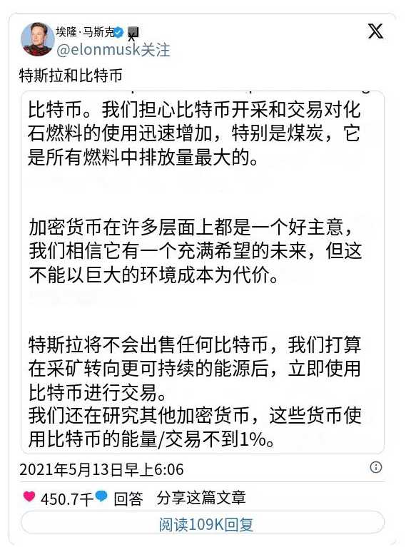 馬斯克提到由於比特幣挖礦和交易中使用化石燃料的情況 「迅速增加」,特斯拉公司宣佈不會出售其任何比特幣持有量,並將在挖礦 「轉向更可持續能源」 後來再次考慮用於交易。他後來澄清稱,一旦礦工使用了 50% 的清潔能源,該公司將恢復使用比特幣進行交易。