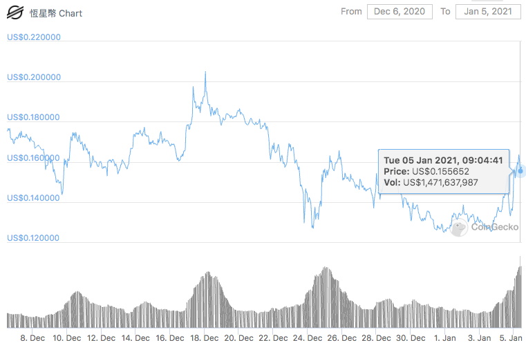 去年 12 月 22 日,瑞波遭美國證券委員會(SEC)起訴,隨後 XRP 便一瀉千里,市場上出現大量賣壓。XLM 也因此一度遭受波及,根據 Coingecko 數據,XLM 在 24 小時內從 0.1687 美元暴跌至 0.1294 美元,下跌幅度近 30%。